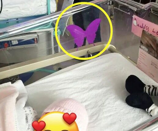 At first glance, a small purple butterfly sticker placed near a newbornโs hospital crib may …