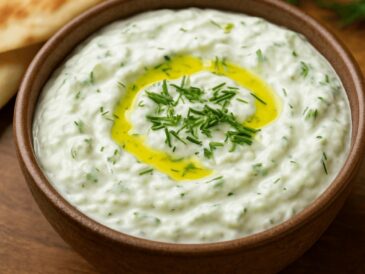 creamy bowl of tzatziki — a classic Greek sauce or dip made from yogurt, cucumber, …