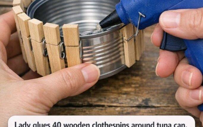 At first glance, the image looks simple: a plain metal tuna can, a hot glue …