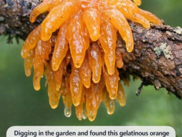 The image shows a bright orange, gelatinous mass growing on a tree branch, with soft, …