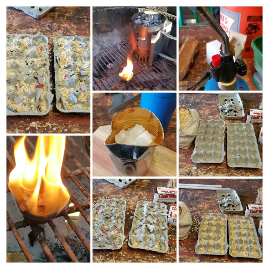 Two paper egg cartons, some planed scrap pine board, $1.50 in paraffin wax, torch and 30 min or so of time… about $0.04 each “cube”. Worked great to start the chimney, but I made them for campfire starters. Bacon grease soaked paper towels are WAY less work for the daily chimney starter, lol…