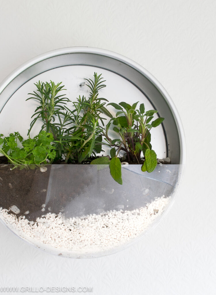 Attach multiple tins to a wooden board or wall to create a vertical garden.