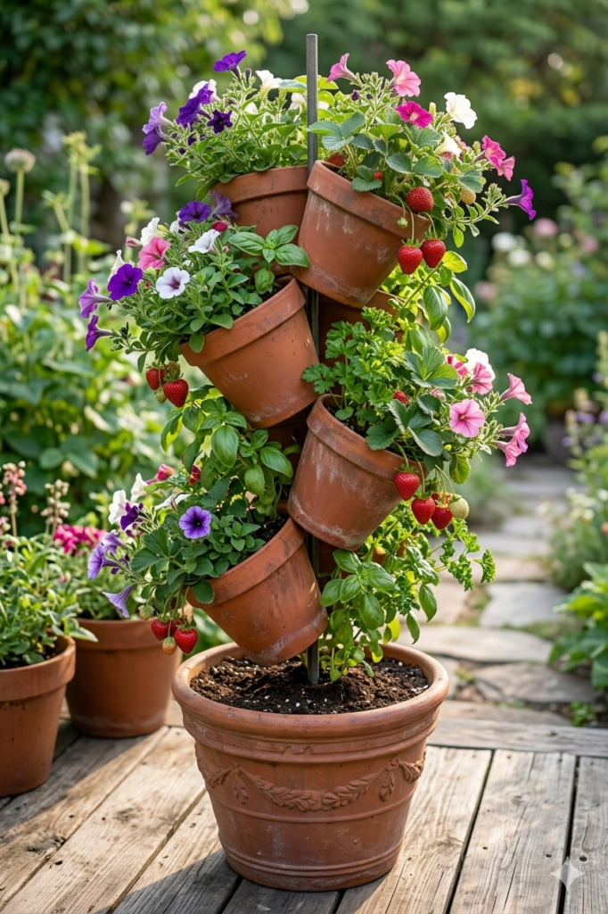 This “tilted pot tower” is exploding in popularity because it’s inexpensive, easy to build, and perfect for everything from vibrant flowers to fresh kitchen herbs and even juicy strawberries.