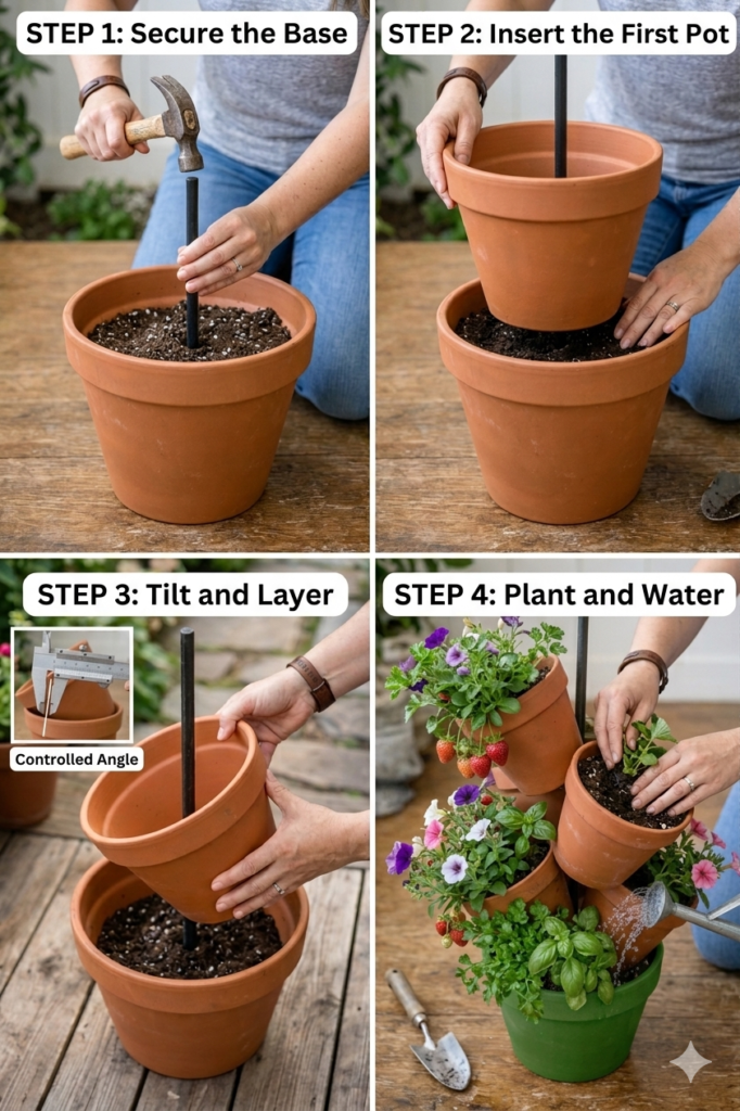 Slide the second pot onto the stake. Instead of sitting it flat, tilt it slightly to one side so the rim rests on the edge of the bottom pot. This creates the “leaning” look that makes this DIY so unique.