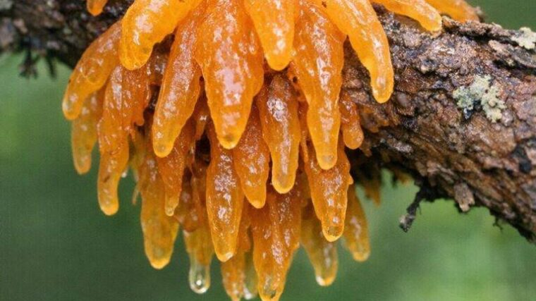 The image shows a bright orange, gelatinous mass growing on a tree branch, with soft, …