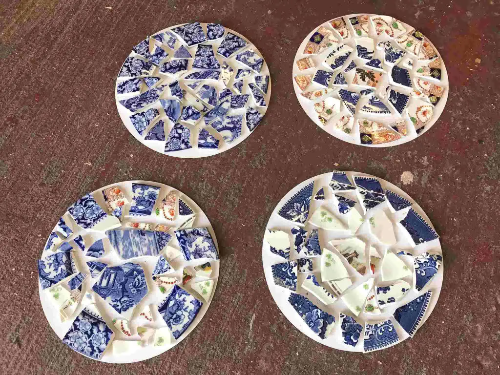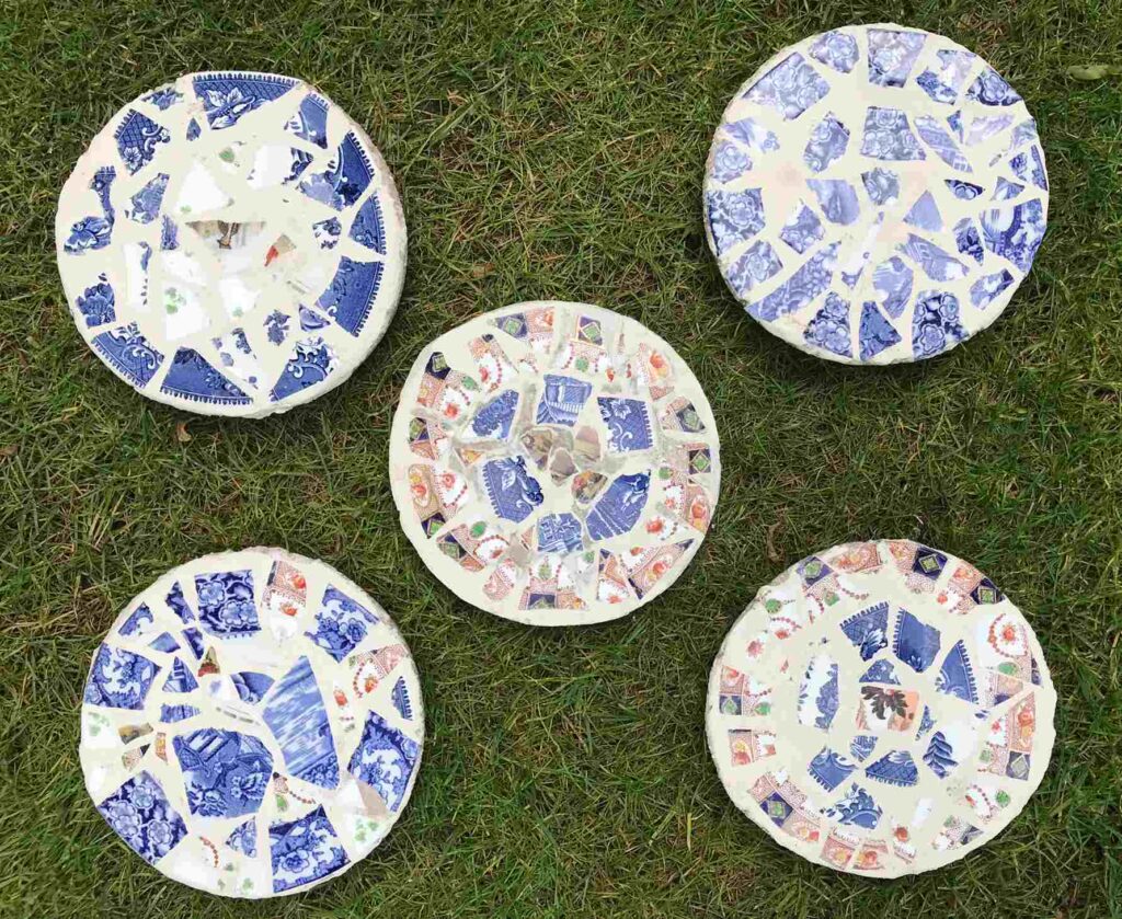 Create decorative stepping stones using broken plate shards. Press the ceramic pieces into wet concrete inside a mold. Once set, apply grout to fill the gaps. It’s a durable and artistic way to pave a colorful garden path.