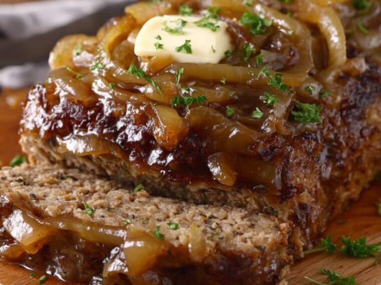 Few comfort foods are as satisfying as a well-made meatloaf, and this French onion-infused version takes the classic dish to an entirely new level. Inspired by the deep, savory flavors of traditional French onion soup, this recipe combines a juicy, tender beef meatloaf with a luxurious topping of slow-caramelized onions simmered in broth and finished with cream. The image perfectly captures the result: a beautifully glazed loaf, sliced thick, crowned with golden onions and a melting pat of butter.