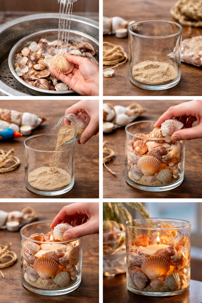 Choose a clear glass jar or candle holder. Transparent glass works best because you will see the shells and the candle light.