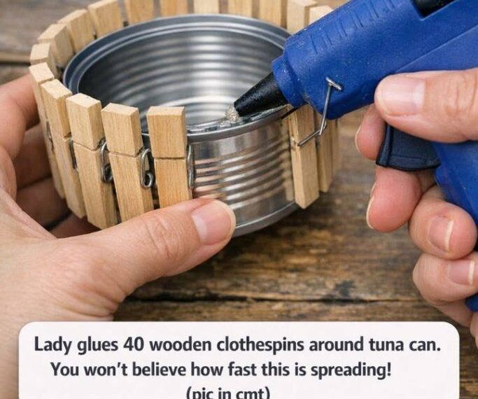 At first glance, the image looks simple: a plain metal tuna can, a hot glue gun, and dozens of wooden clothespins being carefully attached around the outside. But what starts as an everyday household item quickly transforms into a clever and stylish DIY craft that is now trending across social media.