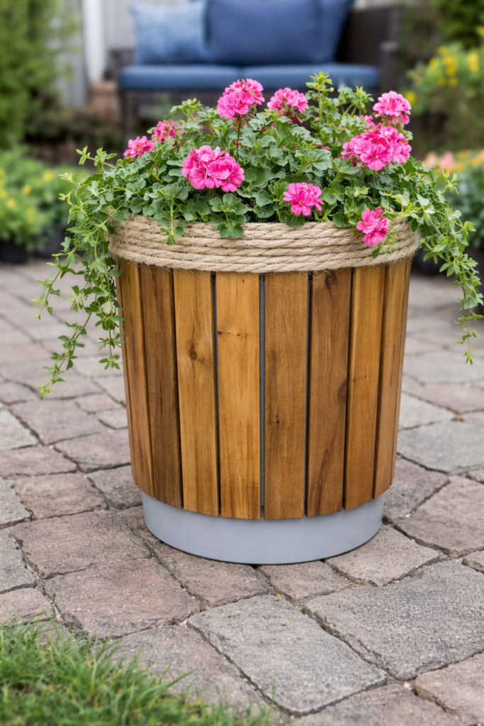 The contrast between plastic and wood is what makes this transformation so effective. The wooden exterior hides the industrial look of the bucket while maintaining its durability. It’s a perfect blend of function and aesthetics.