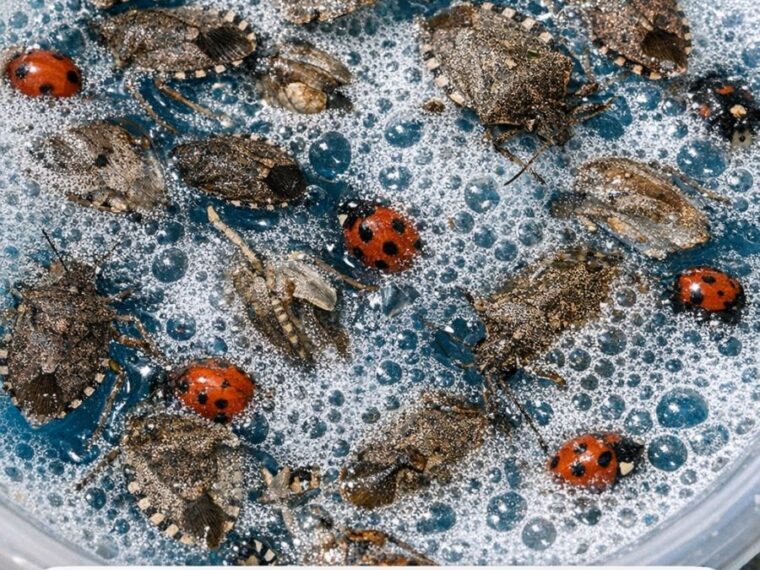 Dish soap breaks the surface tension of the liquid, which means insects cannot stand on the surface and will sink. Vinegar and peppermint oil act as natural repellents, especially for the Brown marmorated stink bug, which hates strong smells.